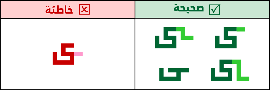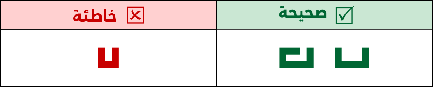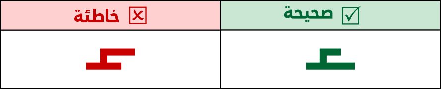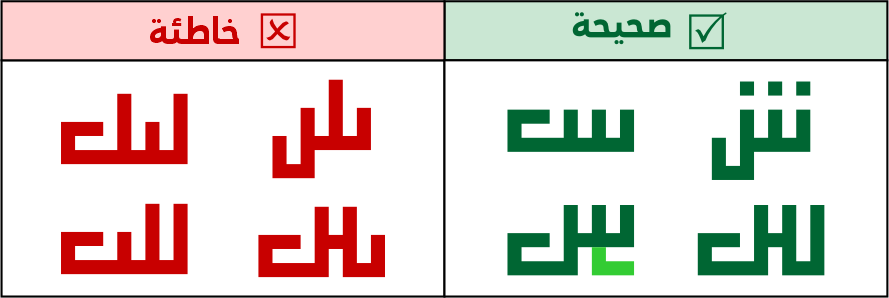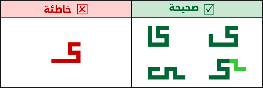 يجوز استخدام الكاف المضغوطة أو قصيرة الرأس أو متوسطة الرأس أو طويلة الرأس، ولا يجوز استخدام الكاف المفتوحة، لاشتباهها مع حروف أخرى مثل (لحـ).