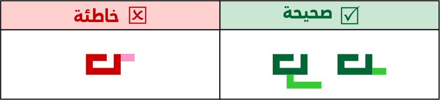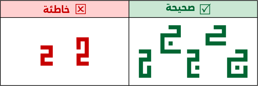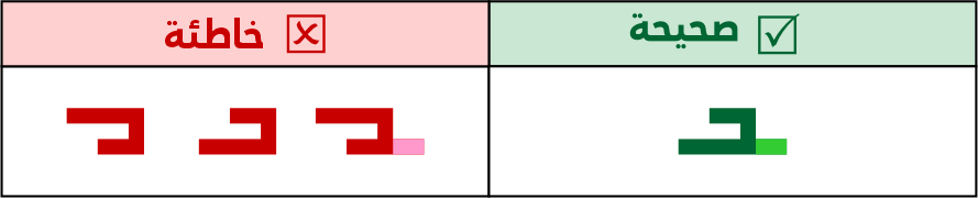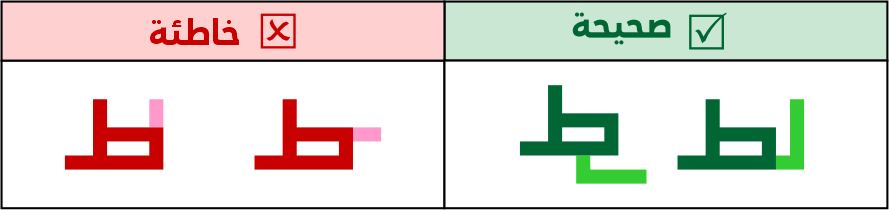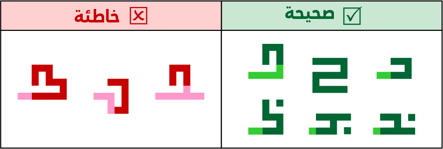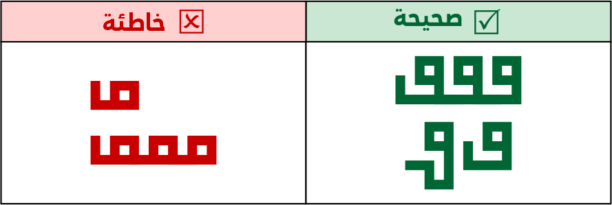 لا يجوز إطالة أسنان الباء وأخواتها بطول يتساوي مع الصواعد أو يكون أطول منها، وتوظيف الكشائد أو حمل الحروف إن لزم الأمر أو تركيبها مع حروف أخرى.