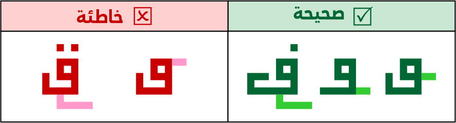 نقاط الفاء والقاف، تكون فوقها أو أمامها أو أسفل ذقنها وعلى طبقها أو كأسها، أفقيًا أو رأسيًا، ولا تكون قبلها، لئلا تشتبه الحروف قبلها، وتستثنى بعض الأوضاع في زاوية 45 لالتقاء النقطين أو أحدهما فوق زاوية عين الحرف.