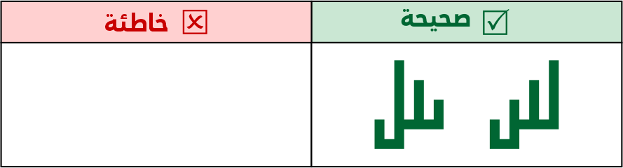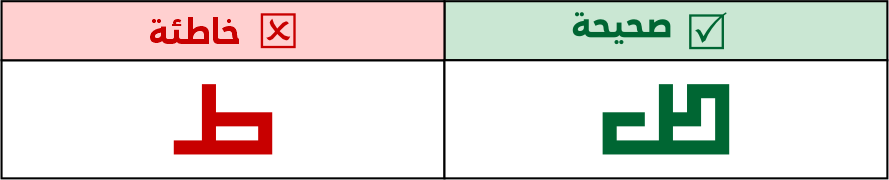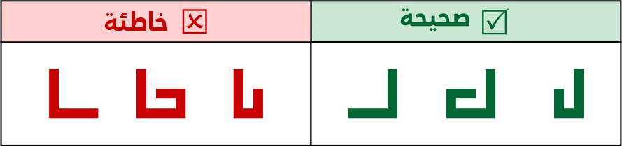لا يجوز كسـر صواعد اللام ألف أو تزويتها، وترسم على هيئة مربعين أحدهما ناقص ضلع وبينهما واصلة.