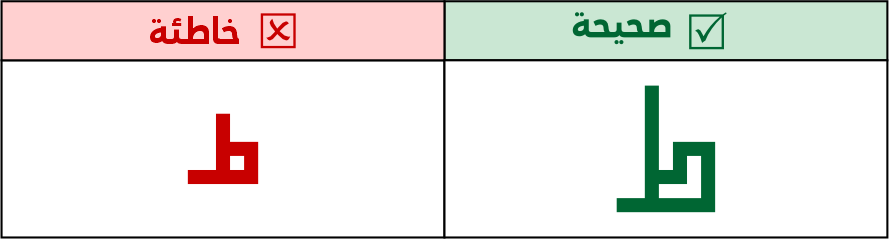 عين الطاء مستطيلة الشكل بعرض 5 مربعات فأعلى، ولا تكون على هيئة مربع لئلا تشتبه مع حروف أخرى ولتتوافق مع شكل وطبيعة الحرف العربي، مع جواز استخدام الطاء الصاعدة.
