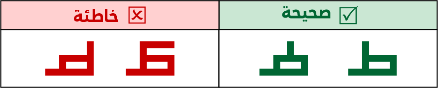 لا يجوز كـسر صاعدة الطاء وأختها، ويتم موجهة الفراغ فوقها باستيعاب حروف أخرى مجاورة أو البحث في أوضاع تزوية حرف الطاء نفسه، صاعدة الطاء وأختها يمكن أن تكون على يسارها أو في وسطها، لكن لا يصح جعلها منكسة في أولها ناحية اليمين.