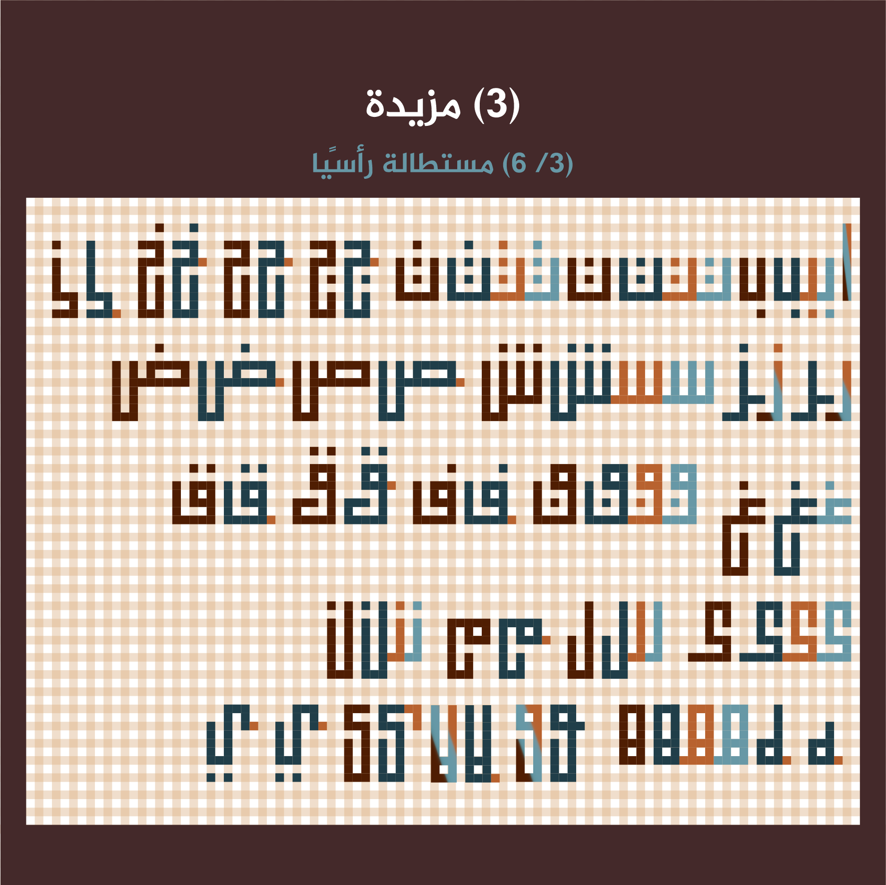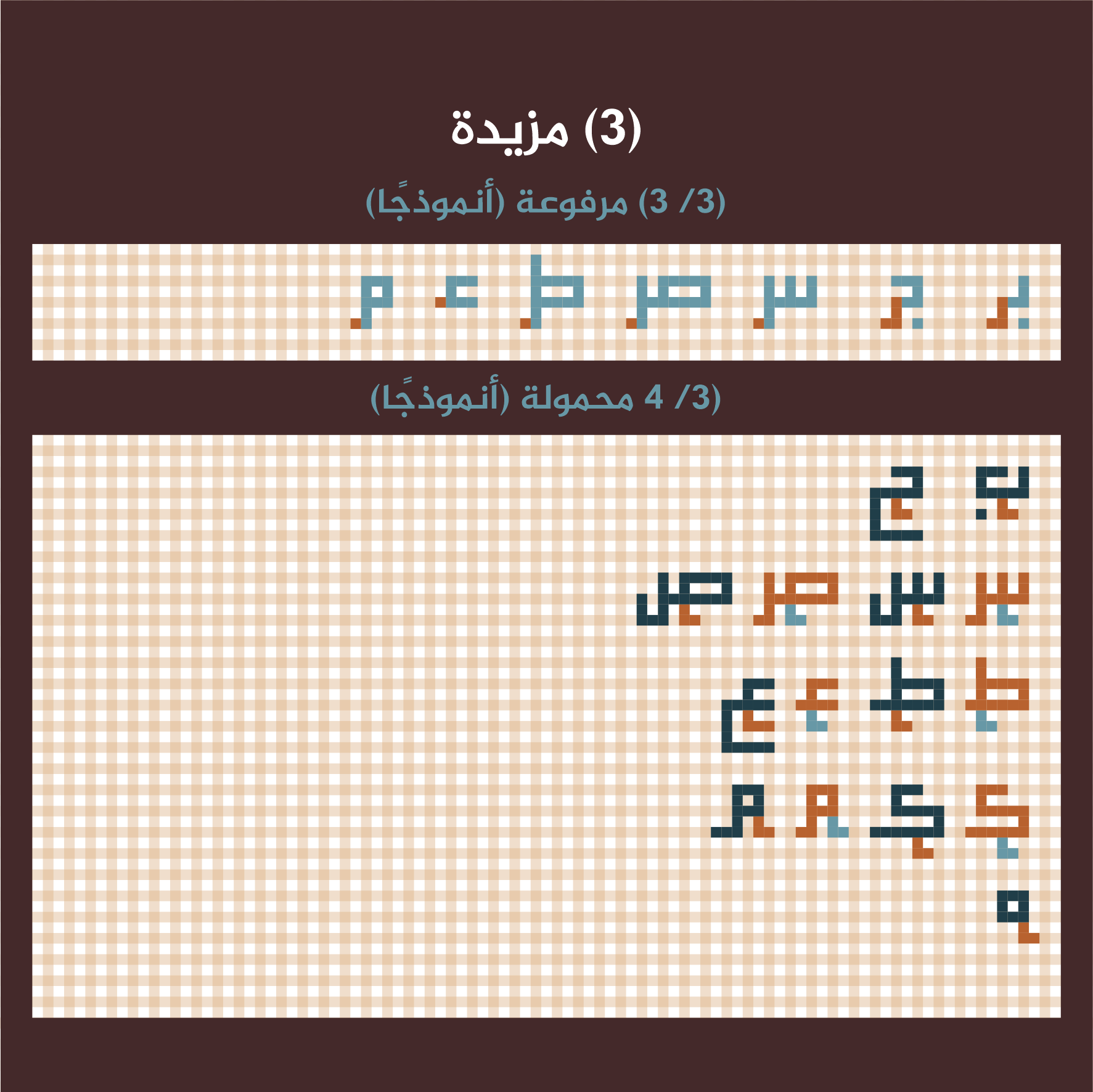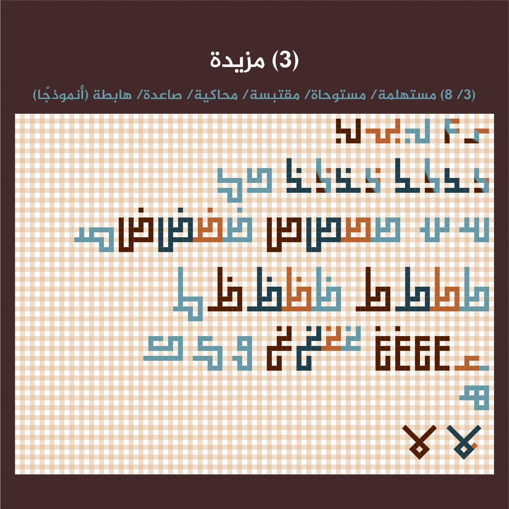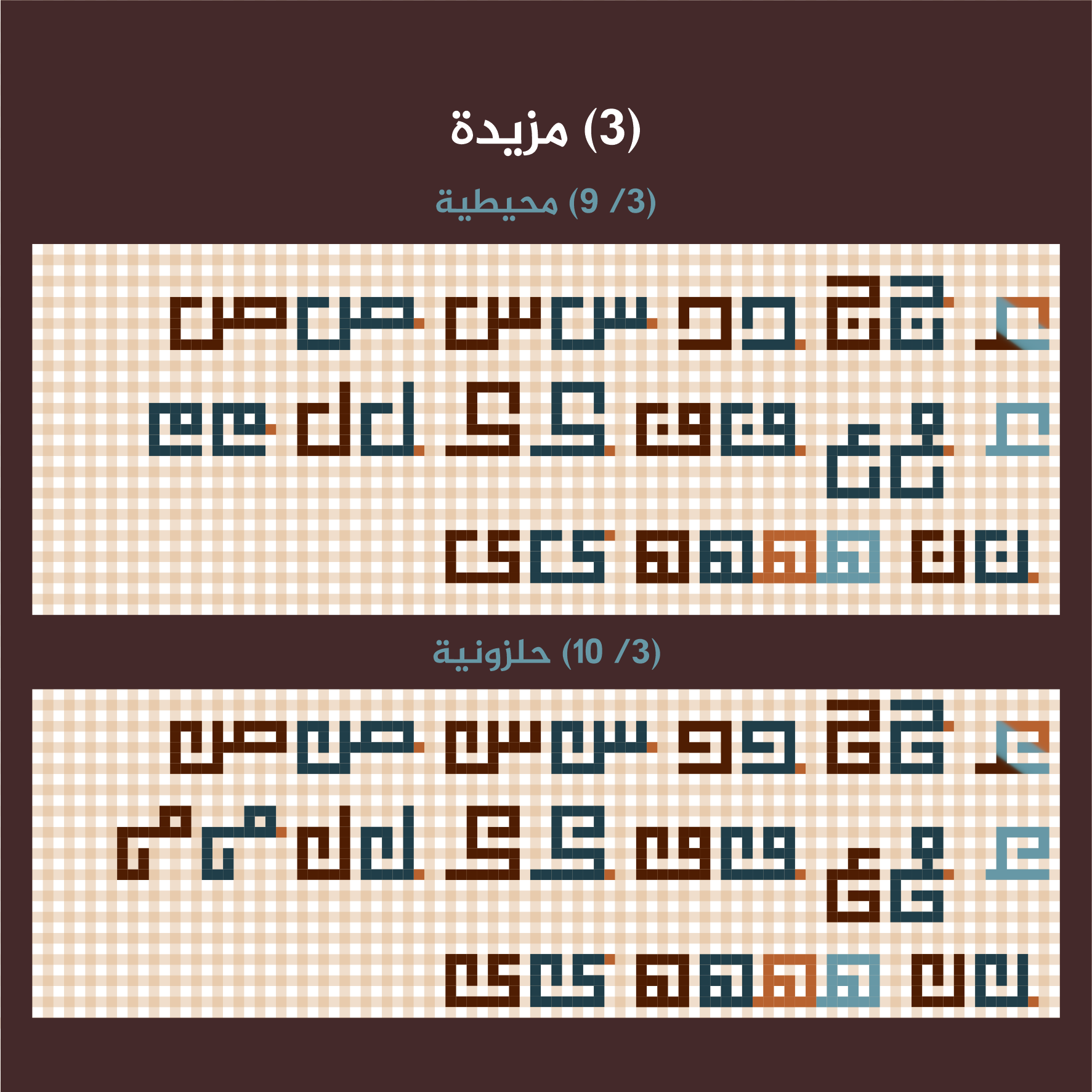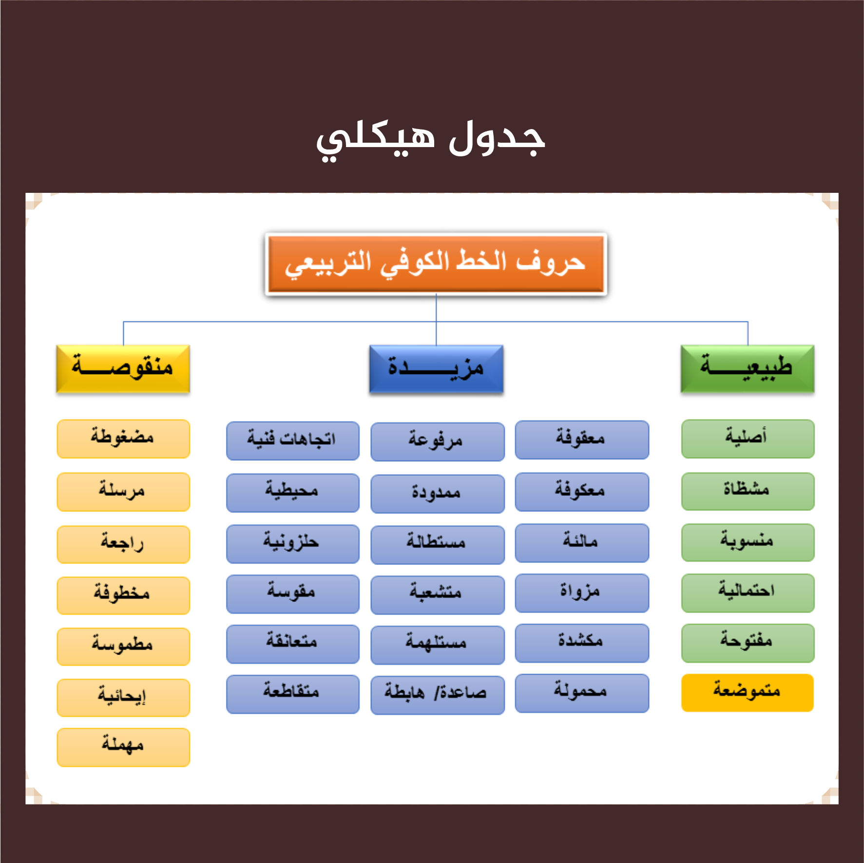 – احتمالية: إمكانية استخدامها في لوحات الكوفي التربيعي إذا صلح موضعها وتراكيبها.
