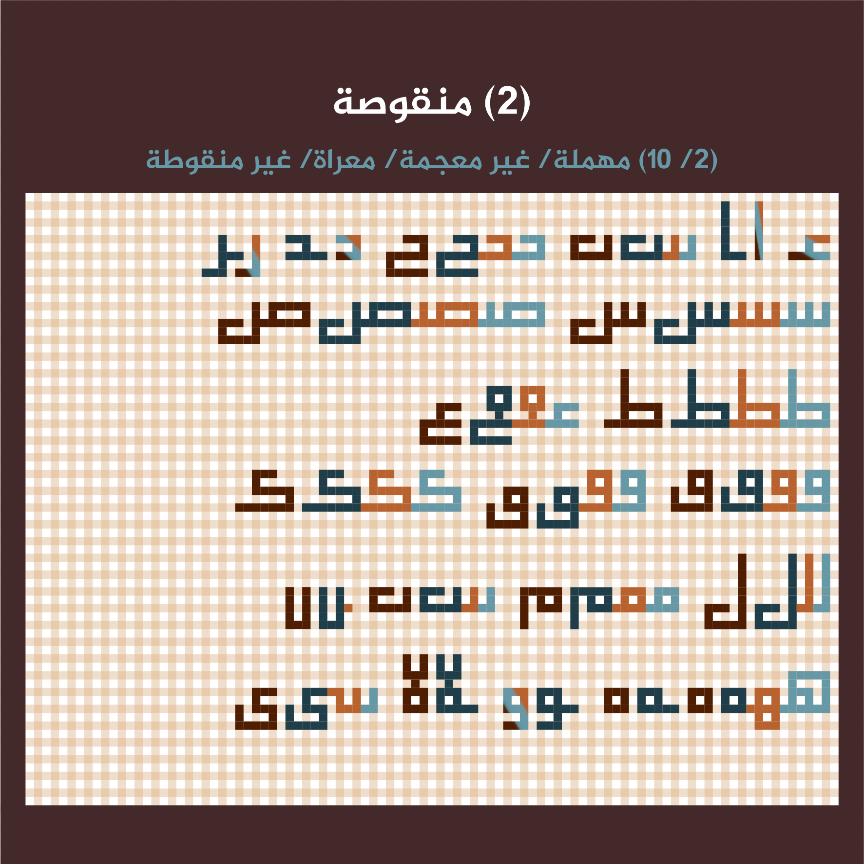 – متموضعة: تم وضع النقاط في أماكنها الطبيعية بالنسبة للحرف وهذا غير معمول به في الكوفي التربيعي إذ يتعين نقل الحروف إلى مواضع الكتل ضمن خطوط الشبكة لينضبط التكوين وعلاقات الكتلة والفراغ.