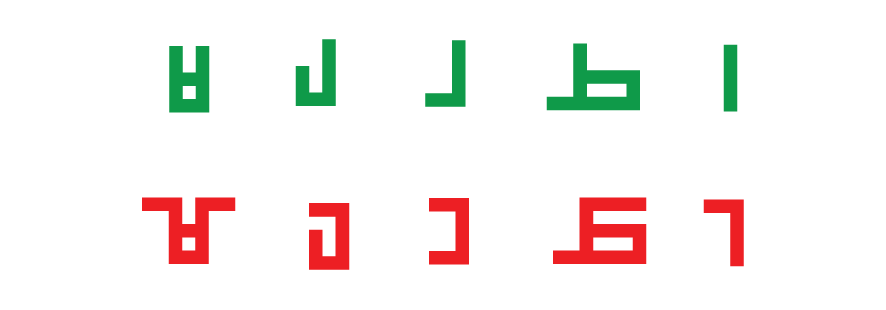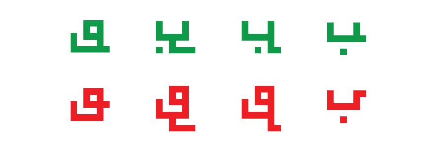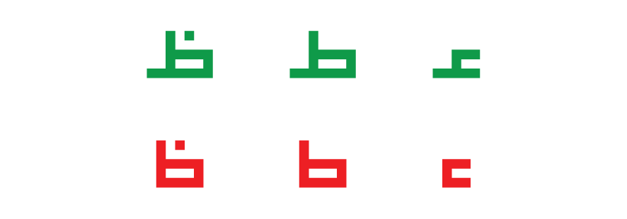 الأصل في الحروف التي تحتوي على أطباق، مثل الباء وأخواتها والفاء أن تكون على السطر القاعدي، ويجوز رفعها، أو حملها بدون تعسف، ويُكره خفضها لاحتمالية اختفاء سنتها الأولى بما يعقد شكل التكوين أو يشتبه مع حروف أخرى.